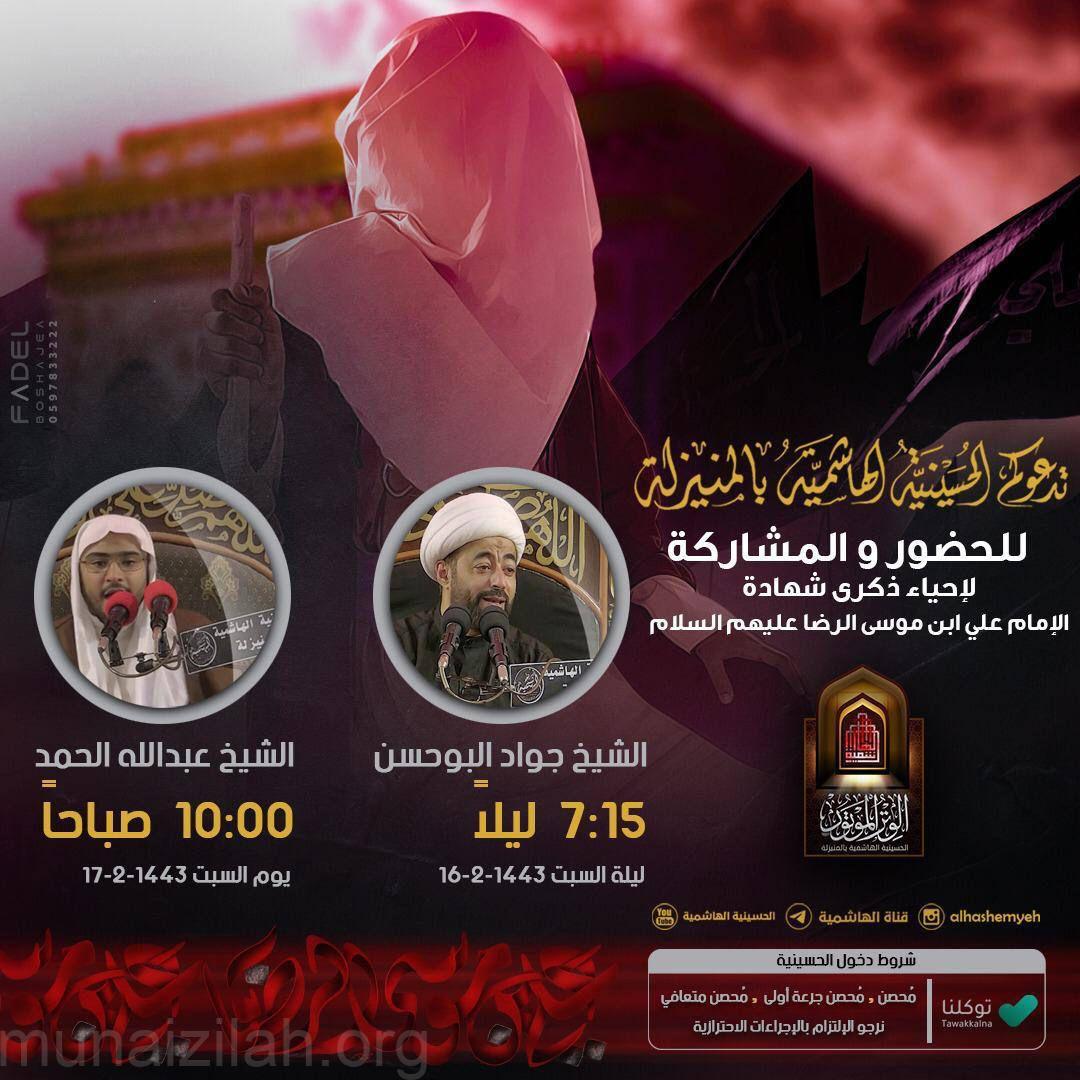 يصادف الليلة ذكرى استشهاد الإمام الرضا عليه السلام، وتقيم حسينيات المنيزلة عزاء لهذه الذكرى الأليمة في الأوقات التالية: