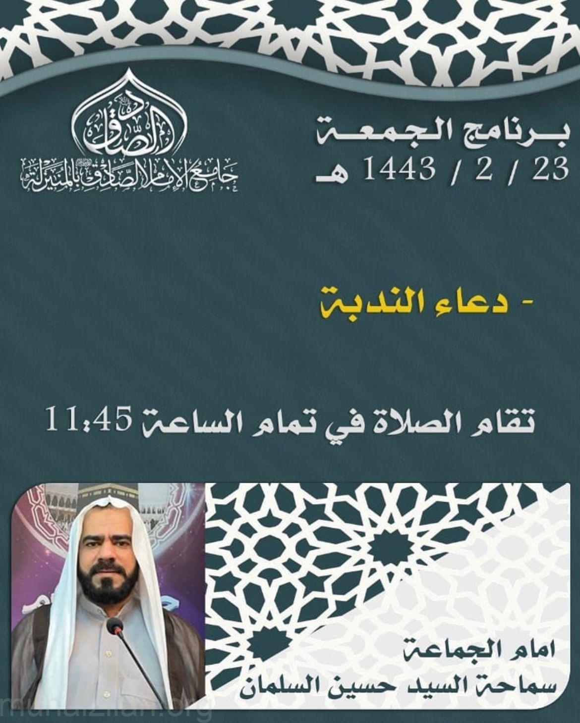 أعلنت جوامع المنيزلة برامجها العبادية ليوم غدٍ الجمعة ومن المستحبات في هذا اليوم قراءة دعاء الندبة وزيارة الإمام الحسين عليه السلام .