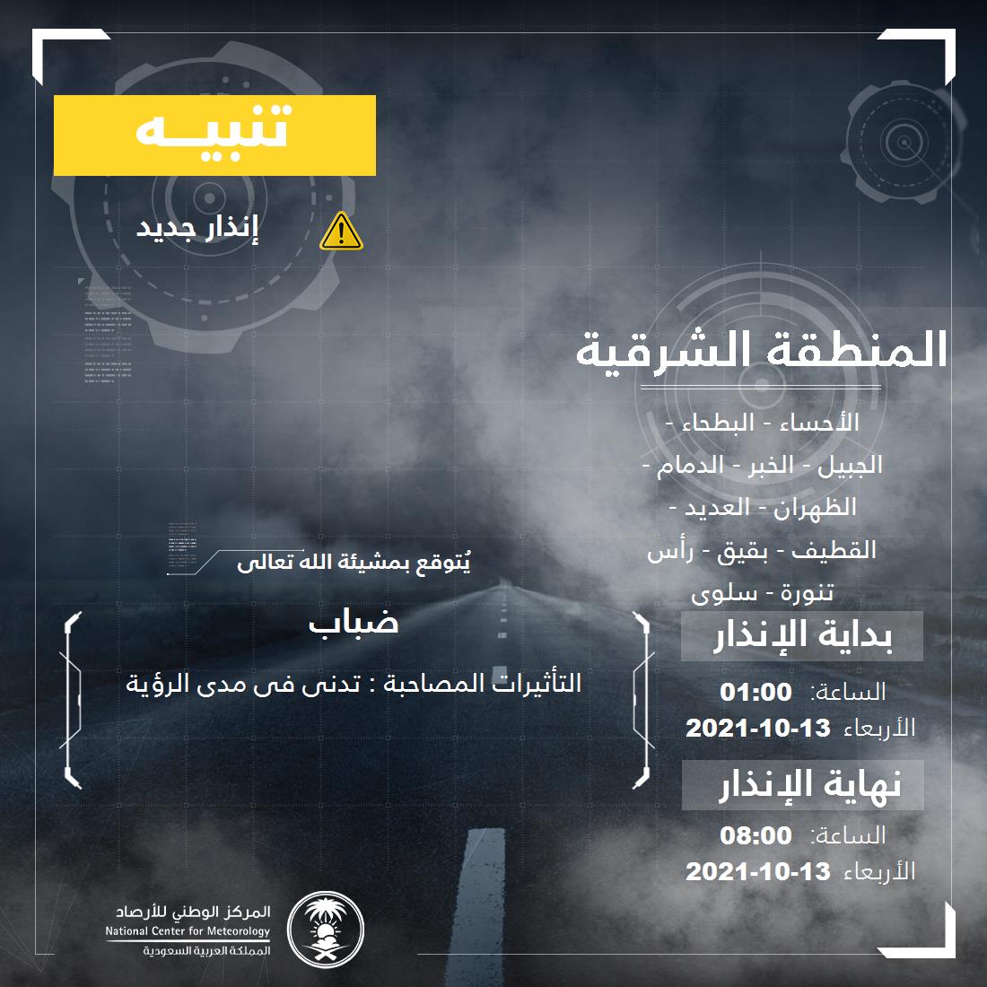 وأشارت الى ان الحالة تشمل «القطيف، الاحساء، الجبيل، البطحاء، الدمام، الخبر،، بقيق، الظهران، العديد، رأس تنورة، سلوى».
