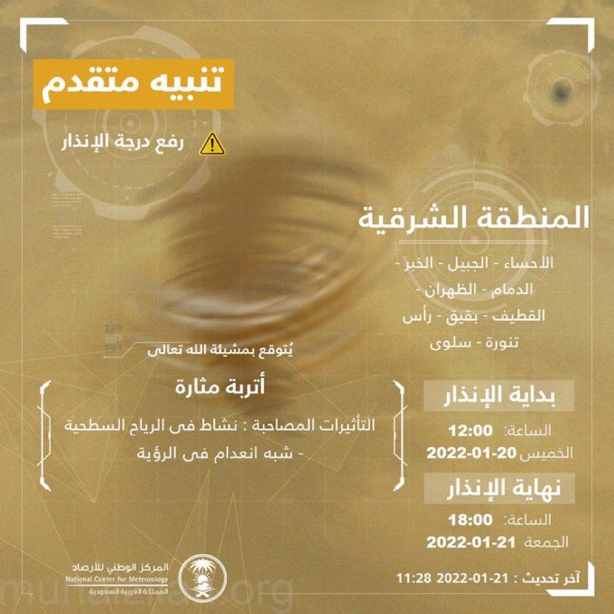 نبه المركز الوطني للأرصاد من قدوم عاصفة ترابية على المنطقة الشرقية (الدمام- الأحساء- الجبيل – الظهران – راس تنورة – الخبر – القطيف – بقيق- سلوى) تبدأ عند الساعة 12:00 وتنتهي عند الساعة 18:00 اليوم