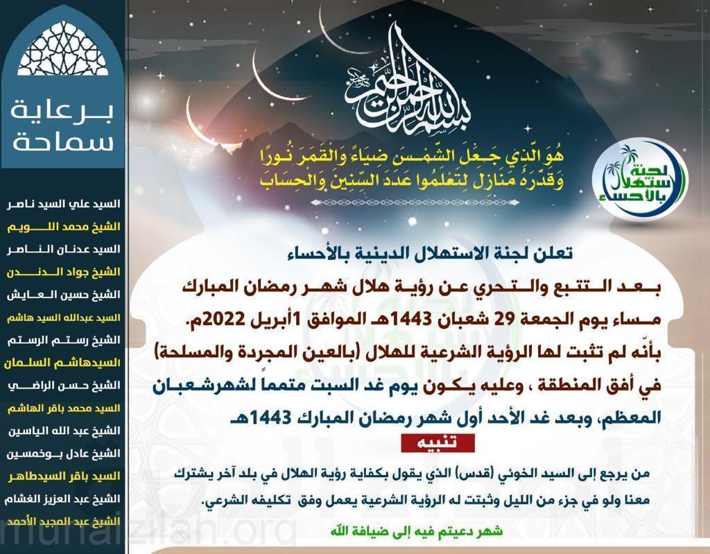 أعلنت لجنة الاستهلال الدينية بالأحساء، أنه بعد التتبع والتحري عن رؤية هلال شهر رمضان المبارك لهذا العام، تبين لها بأنه لم تثبت الرؤية الشرعية للهلال (بالعين المجردة أوالمسلحة) وعليه يكون يوم غدٍ السبت متمماً لشهر شعبان، ويكون يوم الأحد هو أول أيام شهر رمضان المبارك 1443 هـ .