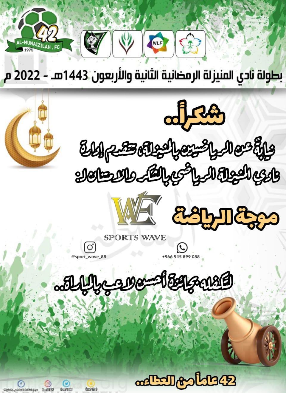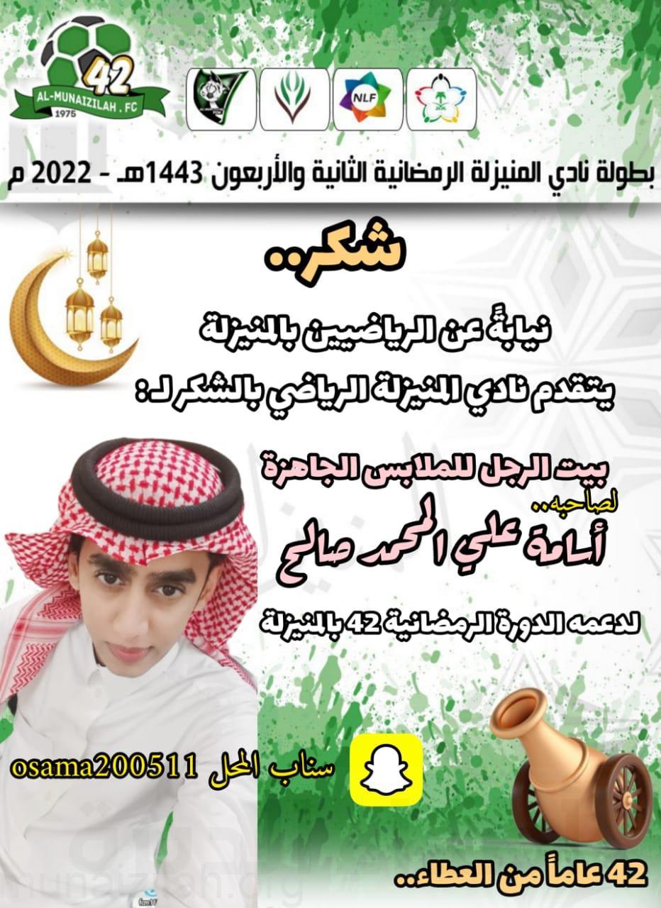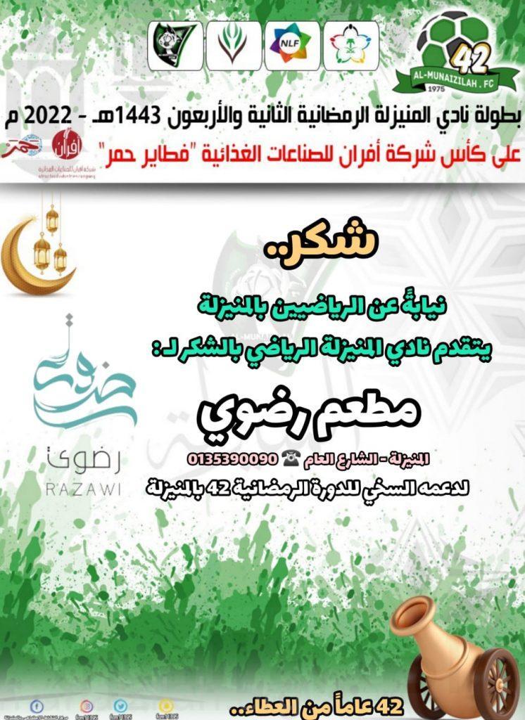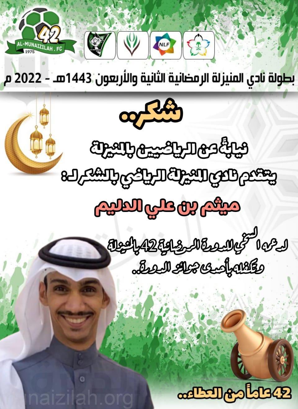 نيابةً عن الرياضيين بالمنيزلة يتقدم رئيس الدورة الرمضانية 42 بالمنيزلة الكابتن طاهر بن عيسى الأحمد بالشكر الجزيل والامتنان الوفير للداعمين على دعمهم وحرصهم على إقامة الدورة الرمضانية وان تظهر بشكل لائق يشرف المنيزلة وأهلها وللحفاظ على الفلكلور الرمضاني الأقدم على مستوى الأحساء عامة..
