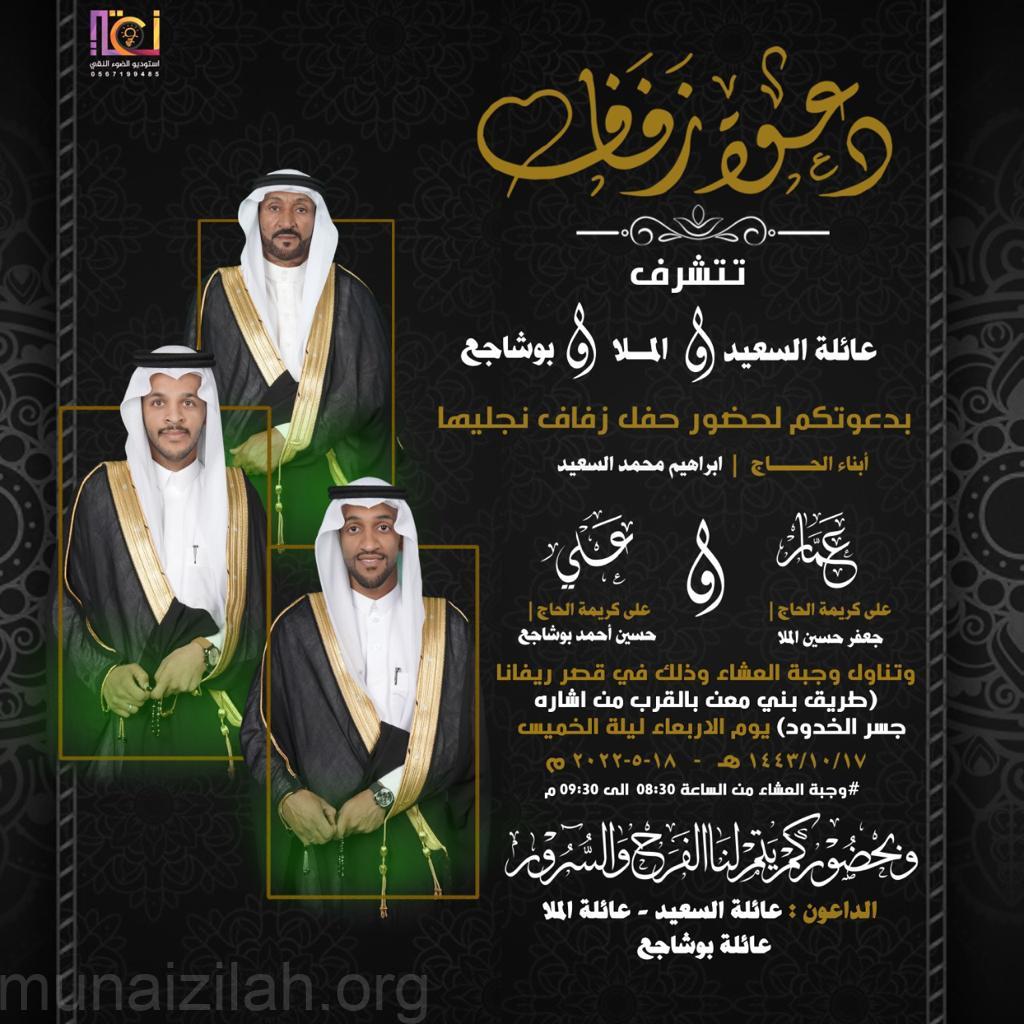 أسرة “صحيفة المنيزلة نيوز” تهنئ العرسان وعوائلهم (السعيد والملا وبوشاجع) وتسأل الله أن يبارك لهم وأن يرزقهم الذرية الصالحة، متمنين لهم حياة سعيدة.