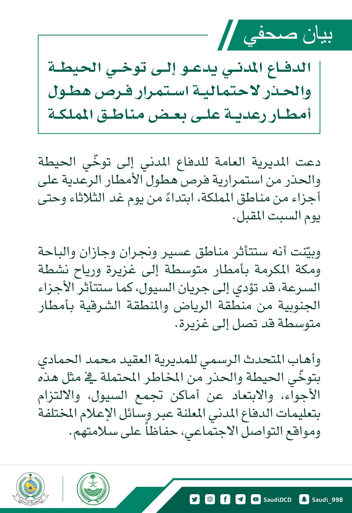 والدفاع المدني يهيب بالجميع أخذ الحيطة والحذر والابتعاد عن بطون الأودية ومجاري السيول والالتزام بتعليماته.