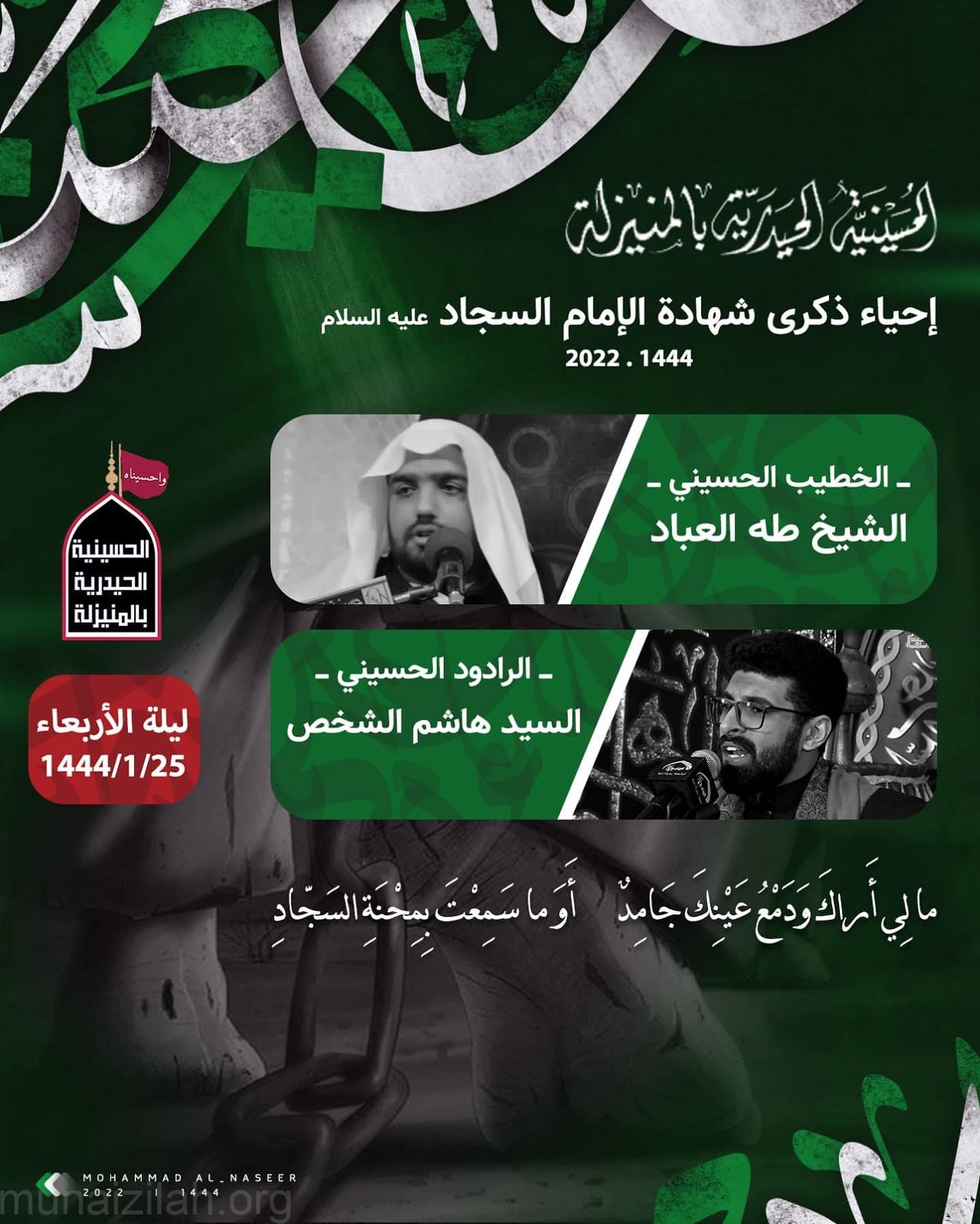 يصادف يوم الـ٢٥ من شهر محرم الحرام ذكرى استشهاد الإمام السجاد (علي بن الحسين – عليهما السلام) مسموماً مظلوماً في المدينة المنورة سنة ٩٤ للهجرة ودفن في مقبرة البقيع جوار عمه الإمام الحسن عليه السلام، وبهذه المناسبة أعلنت مجالس المنيزلة عن احياء ذكرى استشهاد الإمام السجاد (عليه السلام) كالتالي: