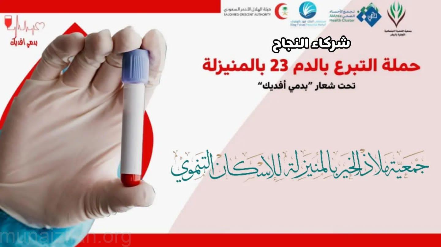 تنطلق يوم غدٍ الجمعة، حملة التبرع بالدم الـ(٢٣) بالمنيزلة تحت شعار «بدمي أفديك» والتي ينظمها مركز النشاط الاجتماعي بالمنيزلة علىمدى يومين بداية من الساعة الرابعة عصراً حتى الثامنة مساءً بالتنسيق مع التجمع الصحي بالأحساء، وتنفيذ بنك الدم بمستشفى الملك فهد بالهفوف.