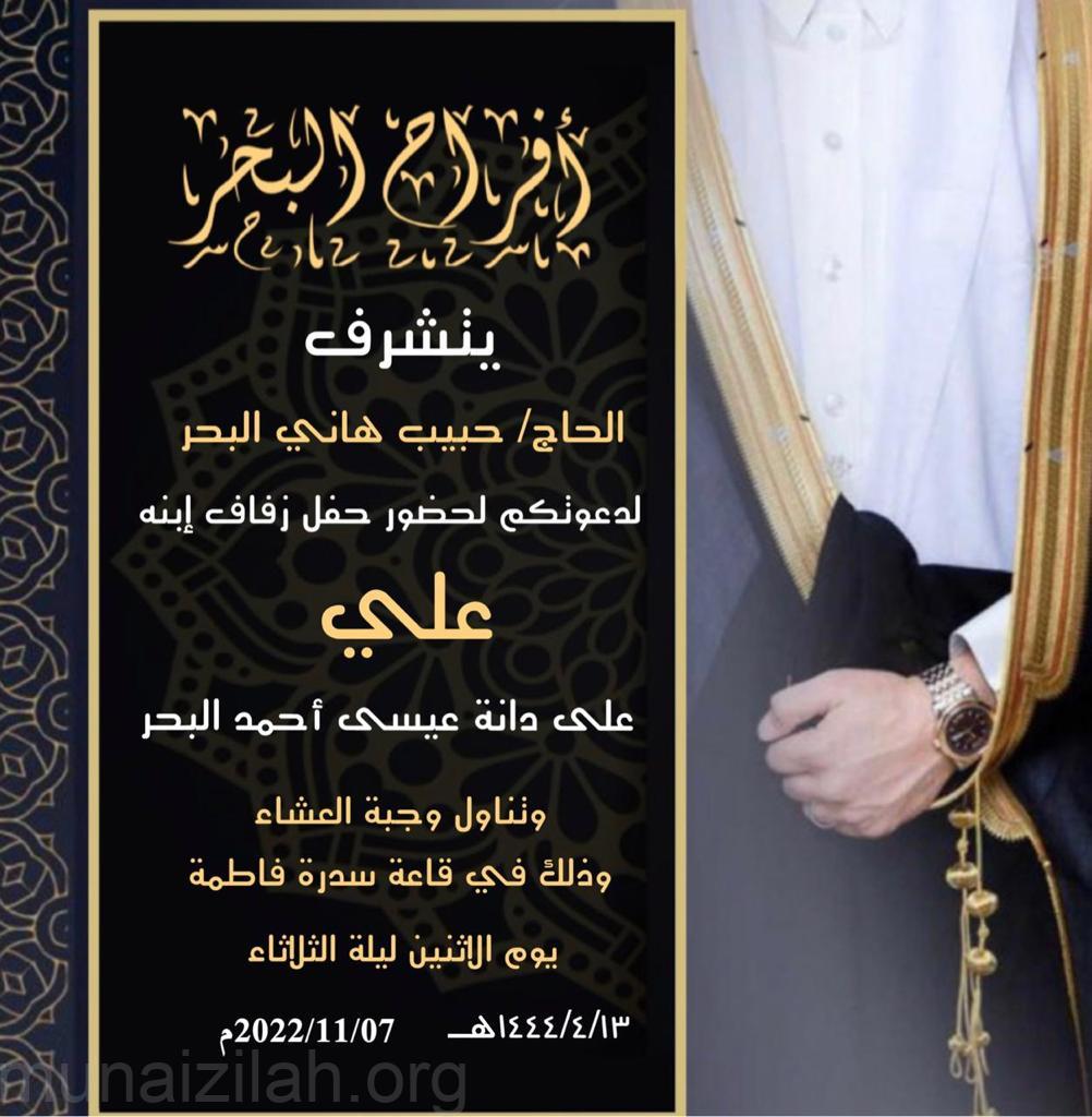 احتفلت عائلة البحر مساء الإثنين الماضي، بزفاف الشاب «علي» نجل الحاج حبيب هاني البحر على كريمة الحاج عيسى أحمد البحر، وذلك في قاعة سدرة فاطمة وسط فرحة الأهل والأصدقاء ومحبي العريسين وحضور جمع من أهالي المنيزلة الكرام.