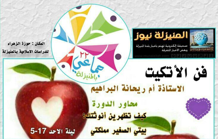 وبعنوان فن الأتكيت تختتم سلسلة هذه الدورات ليلة الأحد ١٧ من الشهر نفسه وعلى الصعيد النسوي أيضًا وفي ذات الحوزة تقدمها الأستاذة أم ريحانة البراهيم .