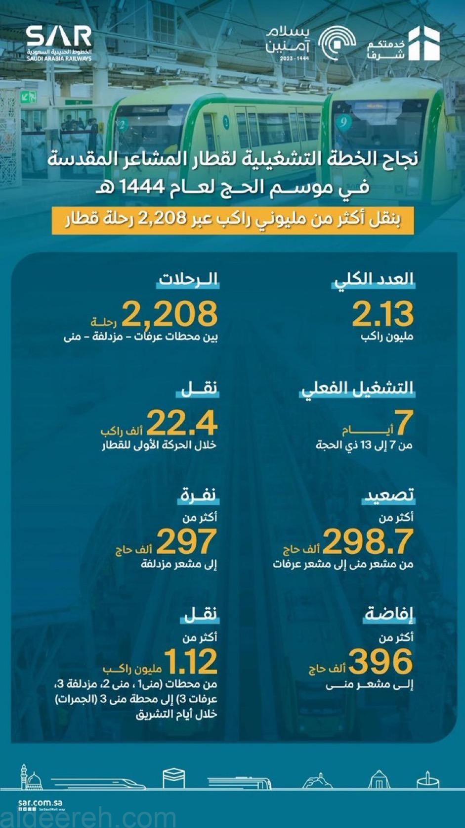 يذكر أن قطار الحرمين السريع يعتبر أحد أهم أنماط منظومة النقل والخدمات اللوجستية التي يستخدمها ضيوف الرحمن، بهدف تسهيل تنقلهم من وإلى المشاعر المقدسة بكل يسر وآمان.