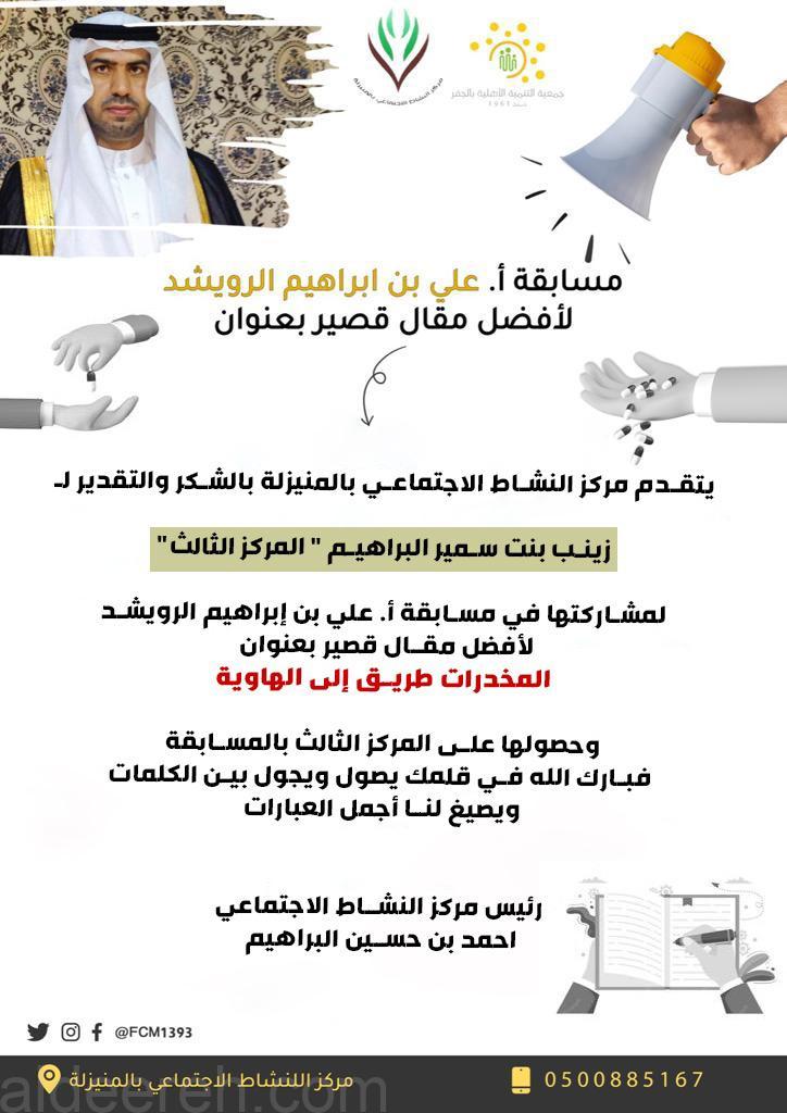 المسابقة التي رعاها وقدم جوائزها الداعم “علي إبراهيم الرويشد” حملت عنوان (المخدرات طريق إلى الهاوية) وشارك فيها أكثر من خمسين مشاركا من الشباب والفتيات وتم استبعاد المشاركات التي خالفت شروط المسابقة ، وتأهلت تسع مشاركات ثم اختيار أصحاب الثلاثة مراكز الأولى الذين حققوا الشروط وضوابط الكتابة .
