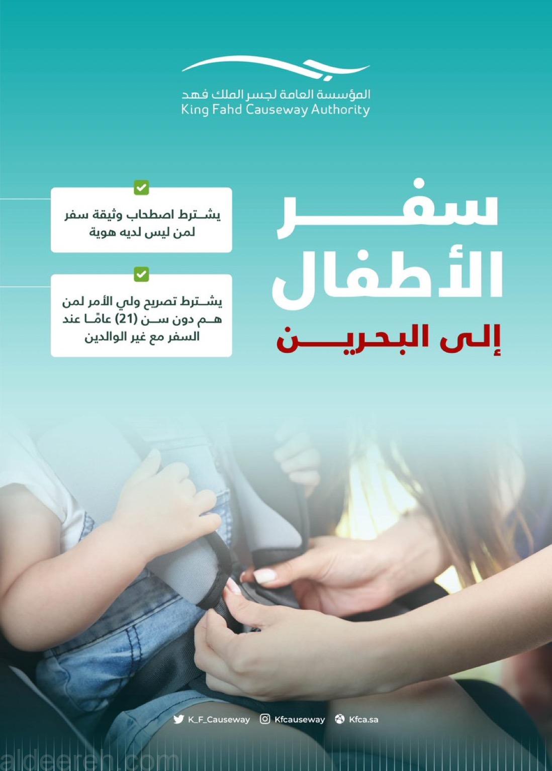 جددت المؤسسة العامة لجسر الملك فهد، التذكير، بالوثائق اللازمة لسفر الأطفال إلى البحرين عبر الجسر.