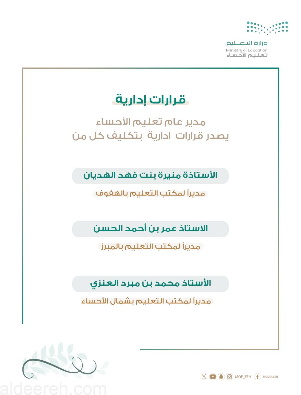 وفي ذات الشأن صدر قرار مدير التعليم بتكليف الأستاذة منيرة بنت فهد الهديان مديرة لمكتب تعليم الهفوف ، وتكليف الأستاذ: عمر بن أحمد الحسن مديراً لمكتب تعليم المبرز ، كما تم تكليف الأستاذ: محمد بن مبرد العنزي مديرا لمكتب التعليم بشمال الأحساء.