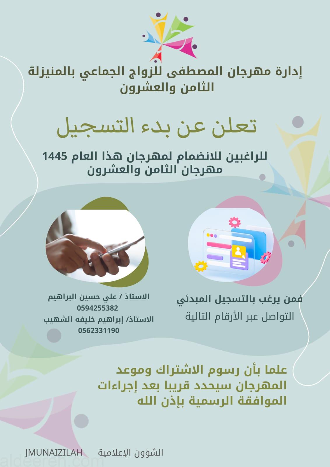 للاستعداد المبكر، وللإعداد الجيد، تعلن إدارة مهرجان المصطفى للزواج الجماعي الثامن والعشرون، بالمنيزلة، عن بدء التسجيل للراغبين في الانضمام لمهرجان هذا العام 1445هـ