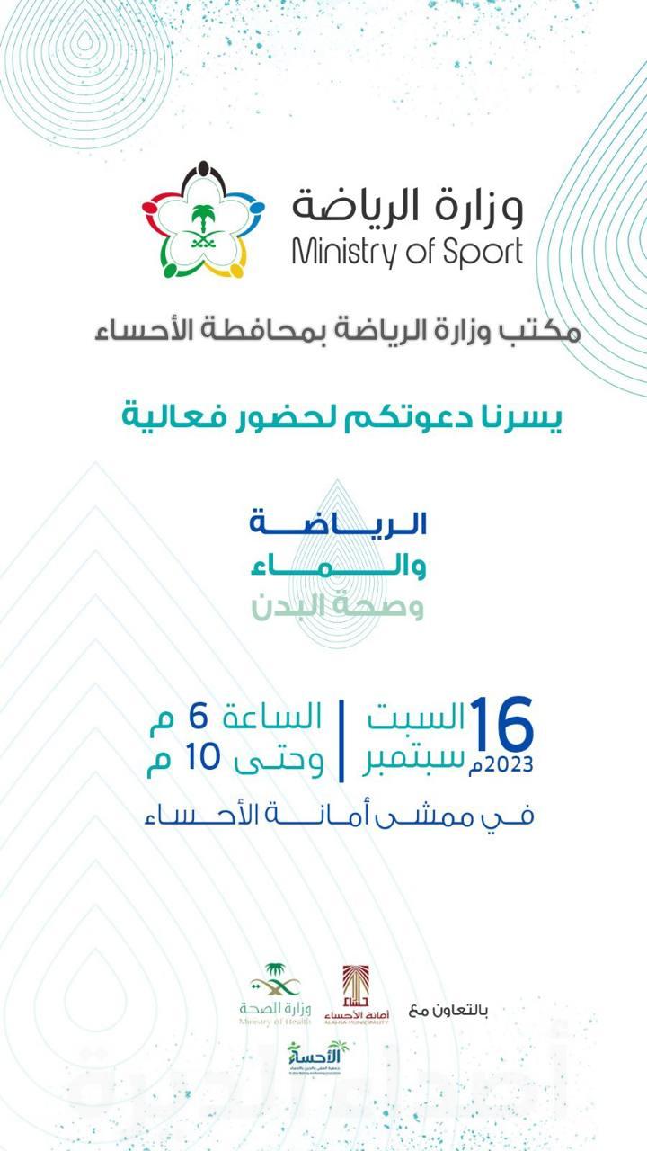 أعلن مكتب وزارة الرياضة بمحافظة الأحساء عن تنظيمه لفعالية (الرياضة والماء وصحة البدن) والتي ستقام السبت القادم ١٦ سبتمبر الحالي في ممشى أمانة الأحساء من الساعة ٦:٠٠ مساءً حتى ١٠:٠٠ مساءً.
