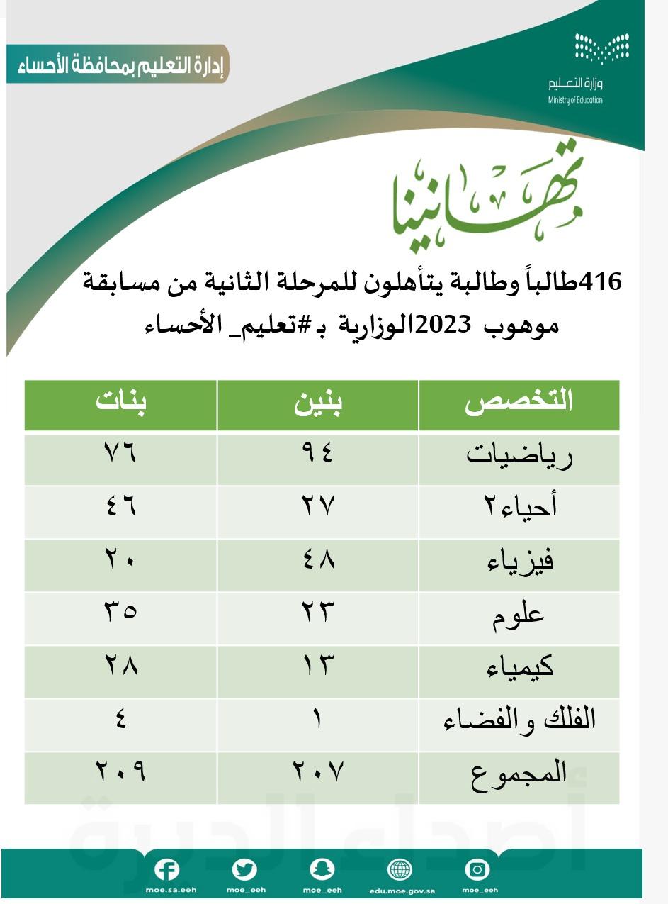 وقد تأهل ٤١٦ طالبا وطالبة من #تعليم_الأحساء للمرحلة الثانية من مسابقة موهوب 2023 والتي ستقام حضوريا يوم ٩ ربيع الآخر ١٤٤٥هـ.