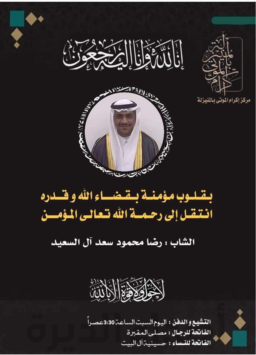 انتقل إلى رحمة الله تعالى الشاب «رضا محمود سعد السعيد» البالغ من العمر ١٩ عاما إثر حادث مروري، أمس الجمعة الموافق ٢٠-شعبان-١٤٤٥هـ، وسيشيع إلى مثواه الأخير، اليوم السبت، في مقبرة المنيزلة الجنوبية الساعة ٣:٣٠ عصرا.