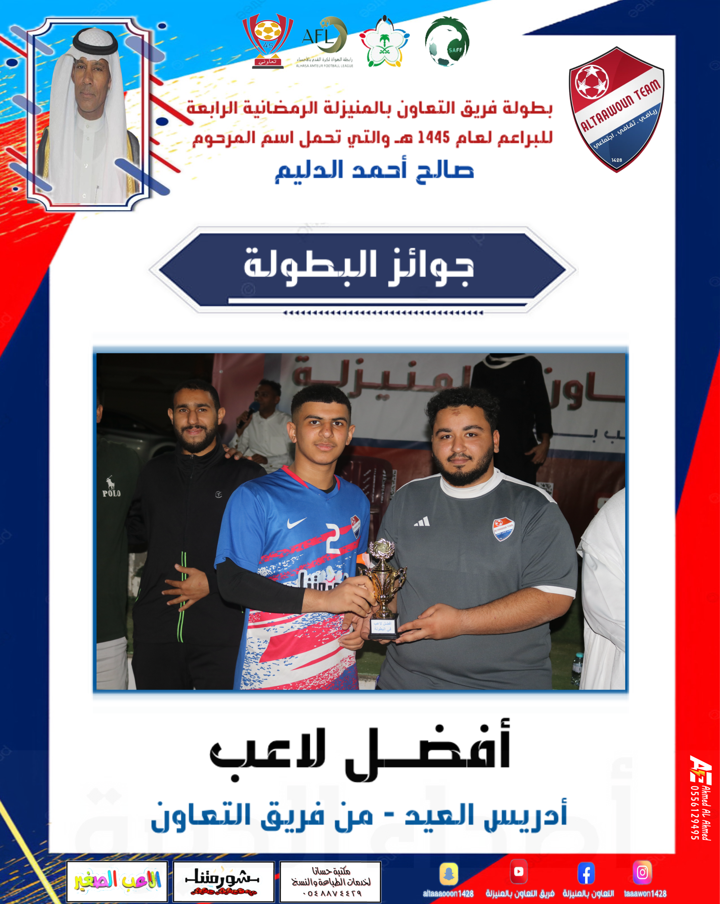 نجح فريق التعاون بالمنيزلة في الجمع بين تنظيم بطولة التعاون الرمضانية الرابعة للبراعم لعام 1445هـ، التي تحمل اسم المرحوم (صالح أحمد الدليم)، وبين إحراز لقب البطولة، وذلك بعد فوز أكاديمية التعاون في المباراة النهائية التي جمعته يوم الأحد الماضي مع فريق النمور بنتيجة 2-0 وبحضور عدد من الجماهير والمهتمين بالرياضة المنيزلاوية.