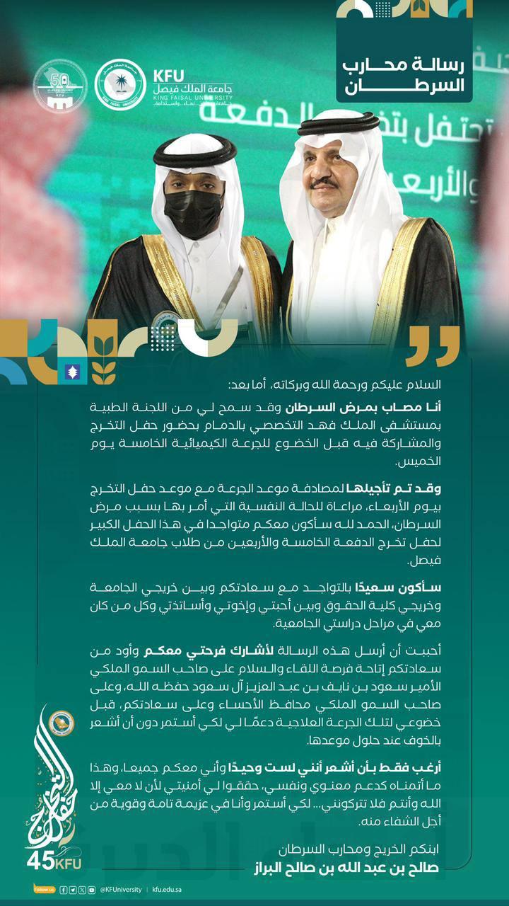 وقد سمحت اللجنة الطبية بمستشفى الملك فهد التخصصي بالدمام، للمريض بحضور حفل التخرج الدفعة الخامسة والأربعين لطلاب وطالبات جامعة الملك فيصل، والمشاركة فيه بعد تأجيل الخضوع للجرعة الكيميائية، لمصادفتها مع موعد حفل التخرج.