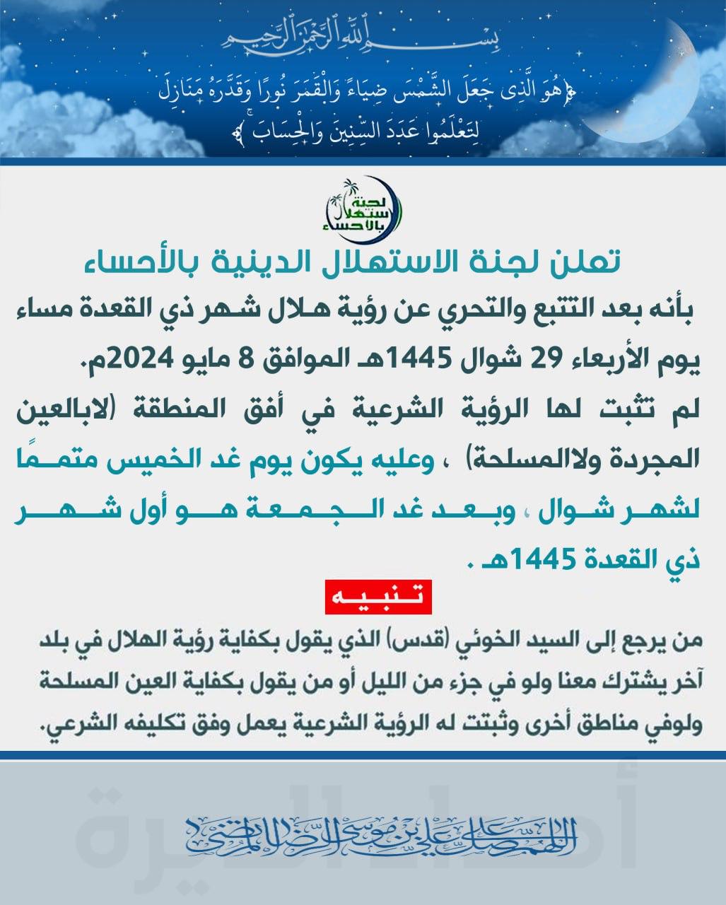 أعلنت لجنة الاستهلال الدينية بالأحساء، عن عدم ثبوت رؤية هلال شهر ذي القعدة هذا اليوم (لا بالعين المجردة، ولا المسلحة) في أفق المنطقة، وذلك بعد التتبع والتحري، وعليه يكون اليوم الخميس هو المتمم لشهر شوال، وغدا الجمعة، الموافق 2024/5/10 – 1445/11/1 هو أول أيام شهر ذي القعدة لعام 1445هـ.