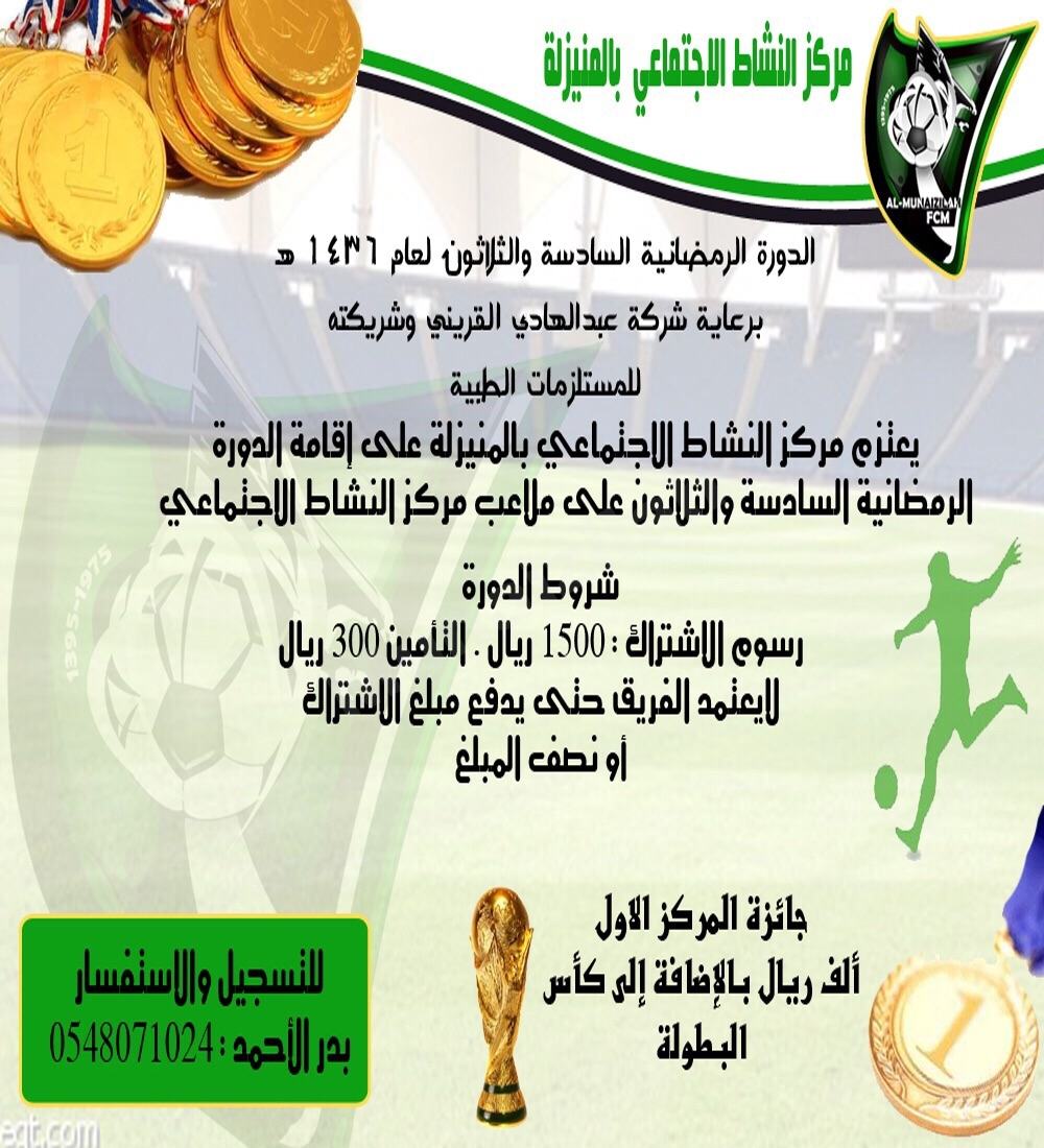 بثّت إدارة مركز النشاط الاجتماعي بالمنيزلة منشورات عبر وسائل التواصل الاجتماعي دعت فيها جميع فرق الحواري بالأحساء للمشاركة في الدورة الرمضانية السادسة والثلاثون التي يعتزم على تنظيمها المركز كالمعتاد والمزمع إقامتها بعد أقل من شهرين من الآن .