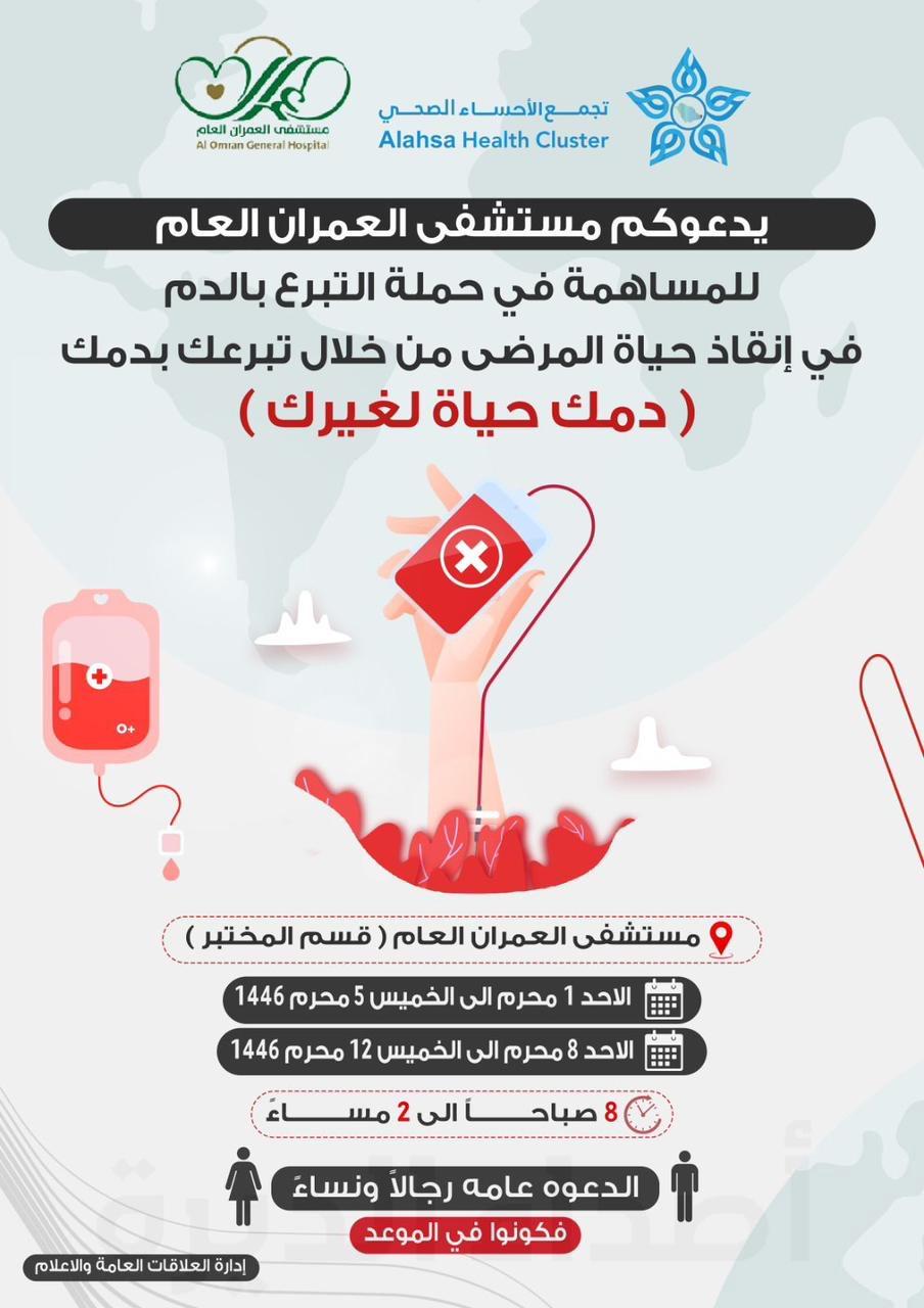 يقيم مستشفى العمران العام في محافظة الأحساء حملة التبرع بالدم #دمك_حياة_لغيرك ابتداء من يوم غد الأحد ١ محرم وحتى الخميس ١٢ محرم ١٤٤٦هـ
