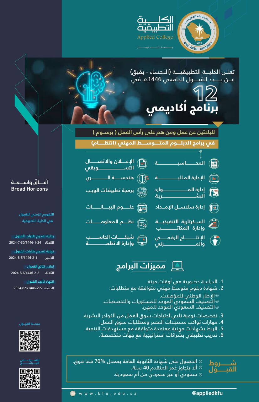وأفادت الجامعة أن التقديم متاح في الكلية التطبيقية (الأحساء – بقيق) للباحثين عن عمل ومن هم على رأس العمل في العديد من التخصصات منها الإعلان والاتصال والمحاسبـة والإدارة الماليــة وهندسـة الـري وإدارة المـوارد البشرية وبرمجة تطبيقات الويب وإدارة سلاسل الإمداد والسكرتارية التنفيذية ونظم المعلومات وعلوم البيانات وغيرها.