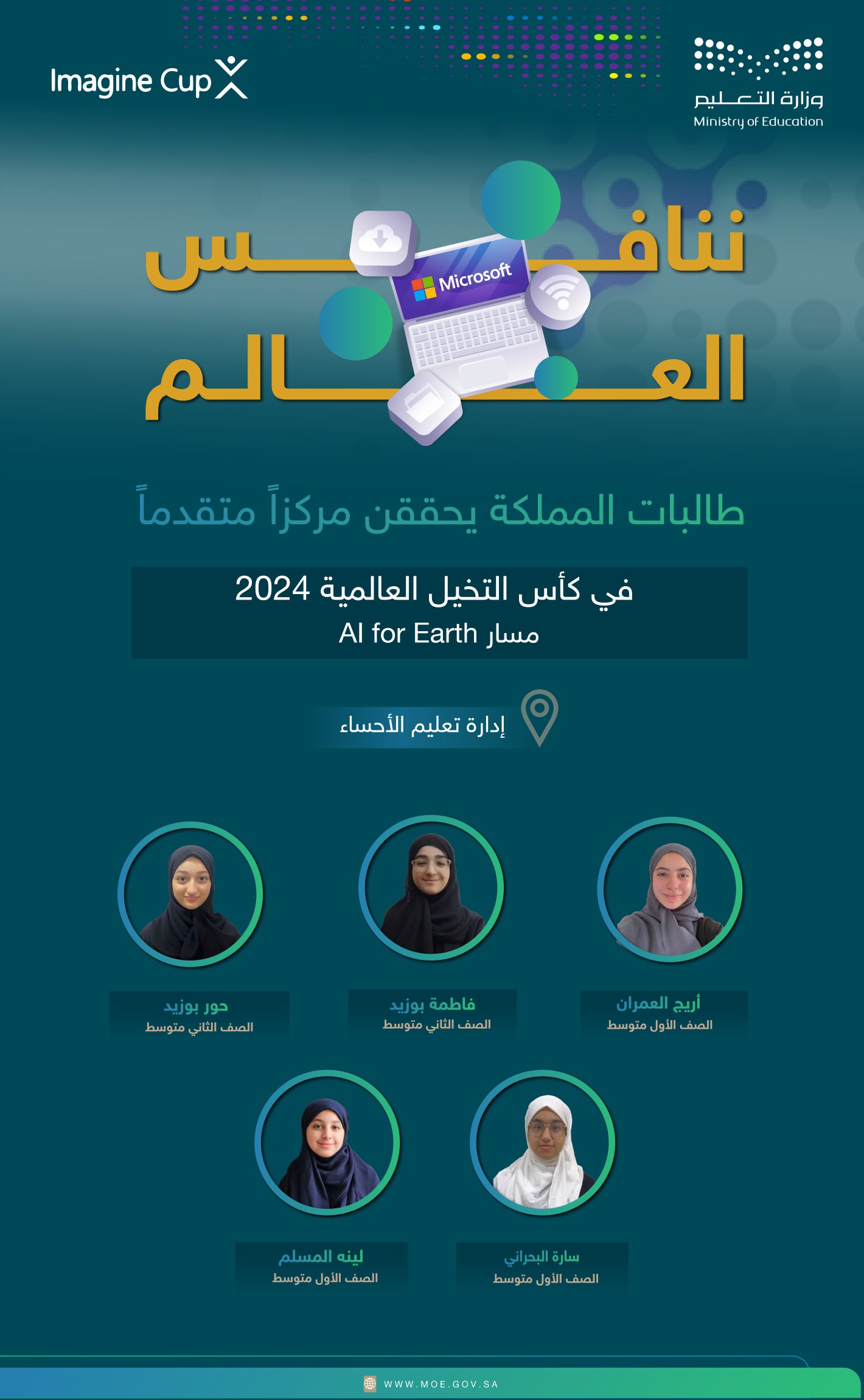 وفاز الفريق السعودي المكون من الطالبات: أريج العمران، فاطمة بوزيد، حور بوزيد، سارة البحراني، ولينه المسلم، بإشراف المعلمة رجاء بوسهيل، بمسار AI for Earth في كأس التخيل العالمية، بعد منافسة قوية مع 1796 فريقاً من طلبة المدارس؛ يمثلون أكثر من 100 دولة.