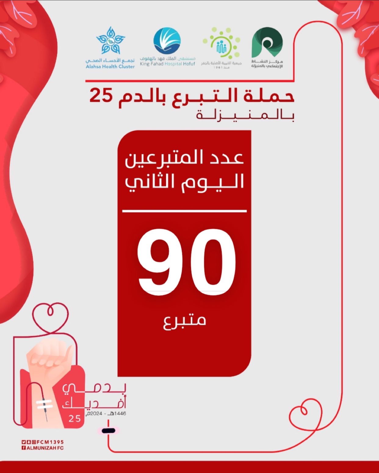 الجدير بالذكر أن المنيزلة ساهمت في دعم بنوك الدم في الأحساء بحوالي (٦٥٨١) وحدة دم خلال (٢٥) حملة.
