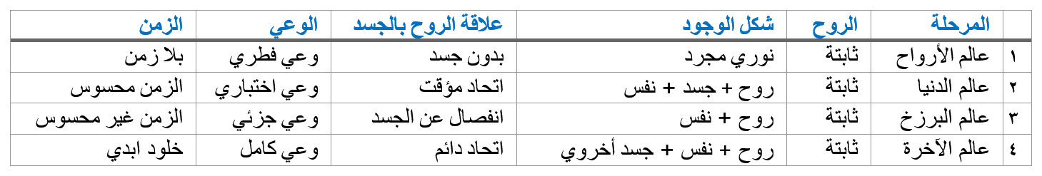 وهكذا، يمرّ كل إنسان بالمراحل الأربع نفسها، ولكن يختلف طول الإقامة في كل مرحلة، بينما تبقى الروح ثابتة والوجود هو الذي يتبدّل، كما في الشكل التالي: