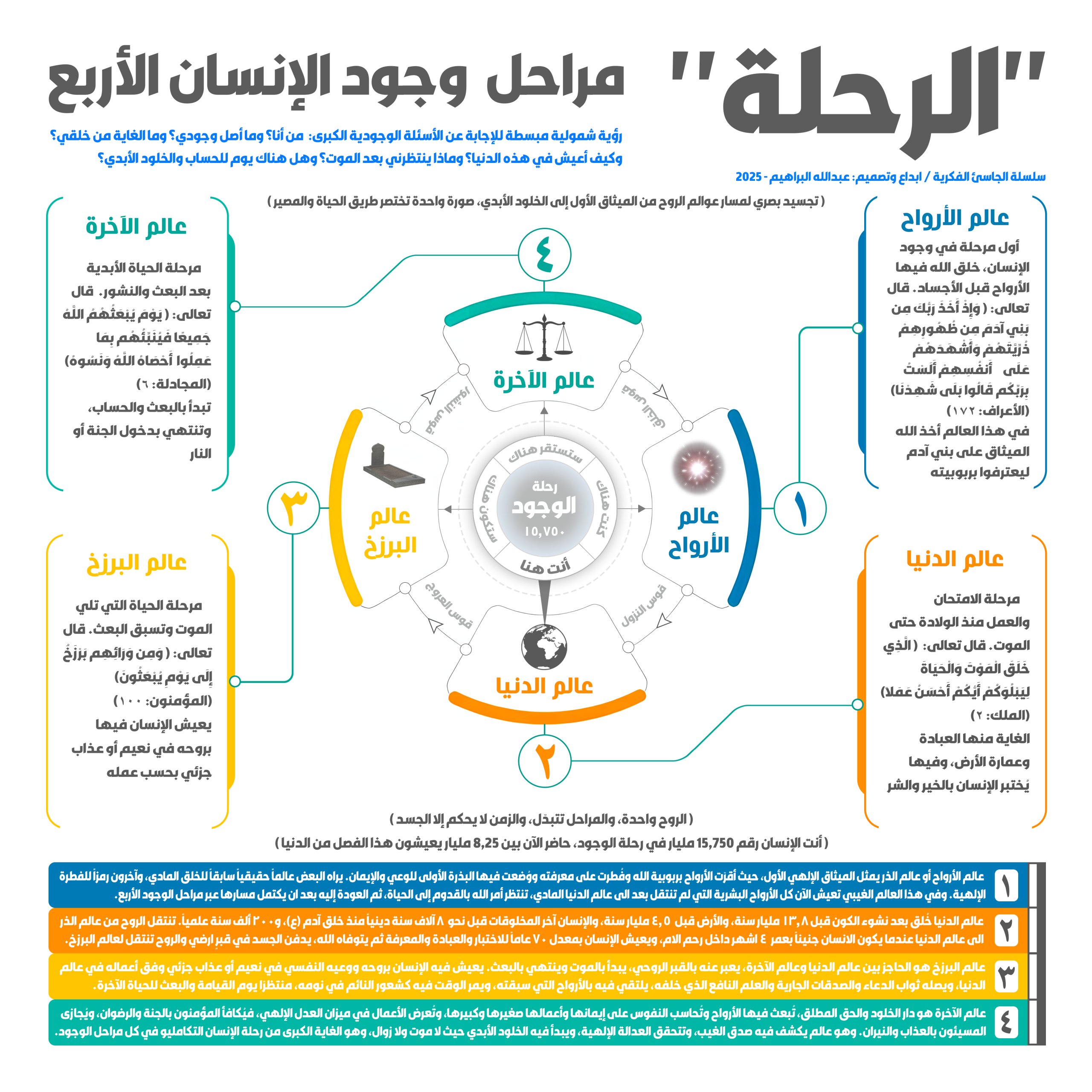 هذا المخطط لا يشرح «ماذا يحدث» فحسب، بل يذكّر «من أنت» داخل كل ذلك: نور ← جسد ← وعي ← بقاء. أنت لست طارئًا على هذا العالم، بل جزء من نسقٍ كونيّ مقصود. إنّ «الرحلة» تعيد ترتيب الأسئلة الكبرى في صورة واحدة: كنت هناك (عالم الأرواح) ← أنت هنا (عالم الدنيا) ← ستكون هناك (عالم البرزخ) ← ستستقر هناك (عالم الآخرة). وبين البداية والنهاية، تظلّ هويتك الروحية فريدة لا تُنسخ أنت تشكلها بعملك في الدنيا فقط.