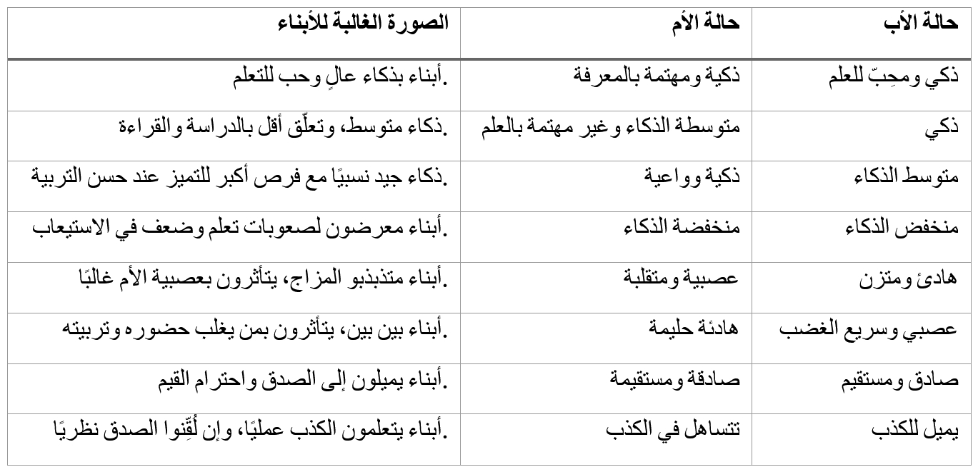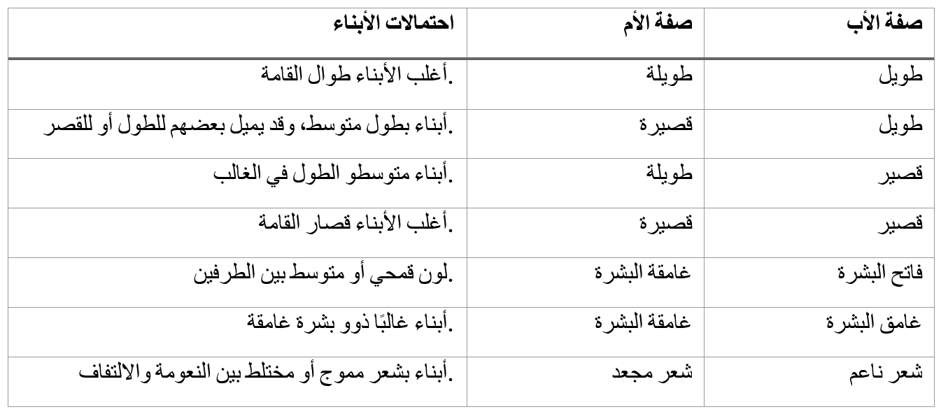 هذا الجدول ليس قاعدة حتمية، بل تقريب لفكرة الوراثة الجسدية، لتوضيح كيف تمتزج صفات الأب والأم في الأبناء:
